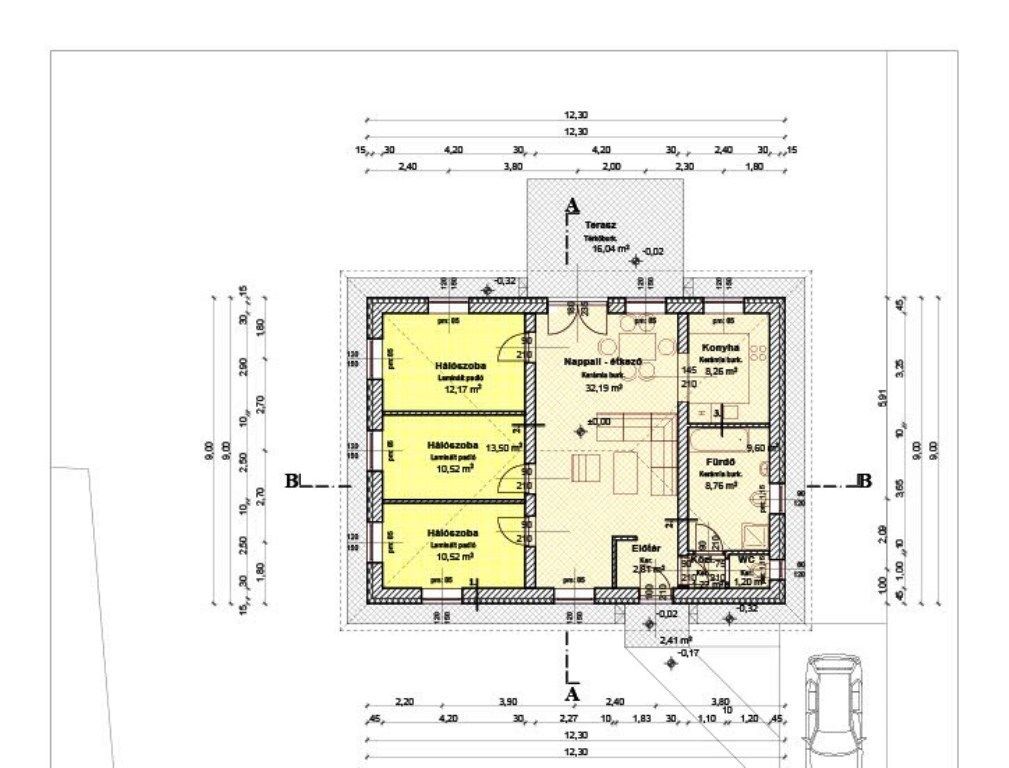 Előtér (2,8 nm), nappali+étkező (32,2 nm), konyha (8,2 nm), 3 hálószoba (12,2nm, és 2x10,5 nm), fürdő (8,8 nm), közlekedő (1,3 nm), WC (1,2 nm) és terasz (16 nm).