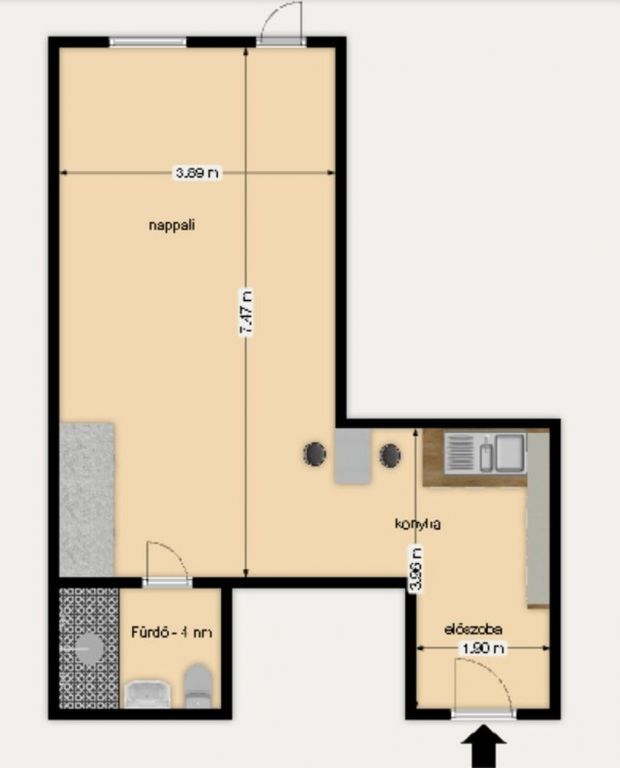 - az egyik oldalon beépített szekrény, a másikon nappali/háló