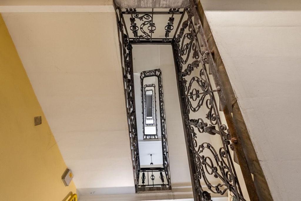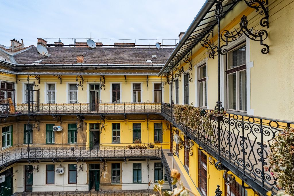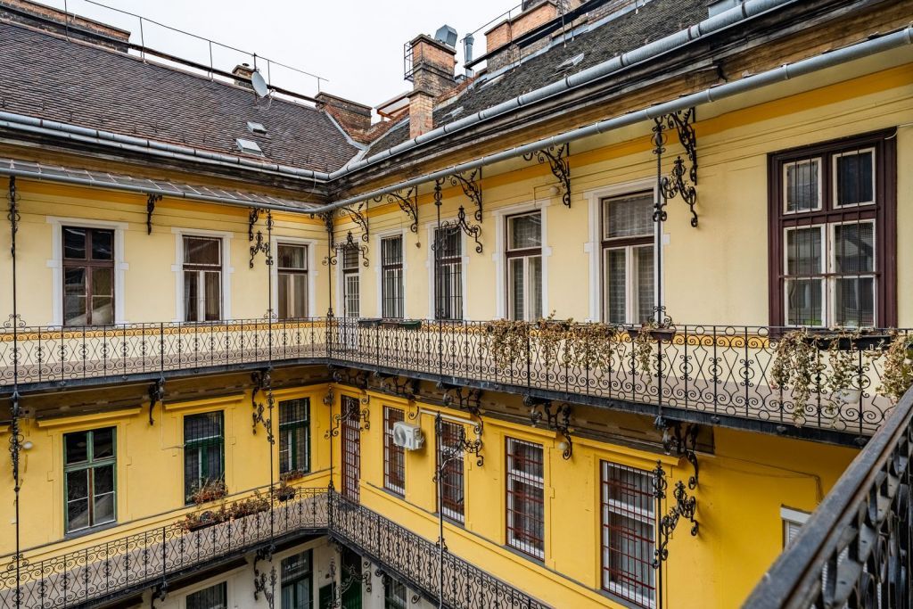 Karbantartott belvárosi társasház, rendezett lakóközösséggel, megőrzött eredeti építészeti részletekkel.