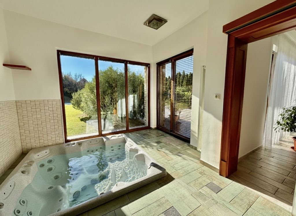 - nagyméretű kültéri 55m2-es fűthető medence motoros fedéssel, extrákkal
