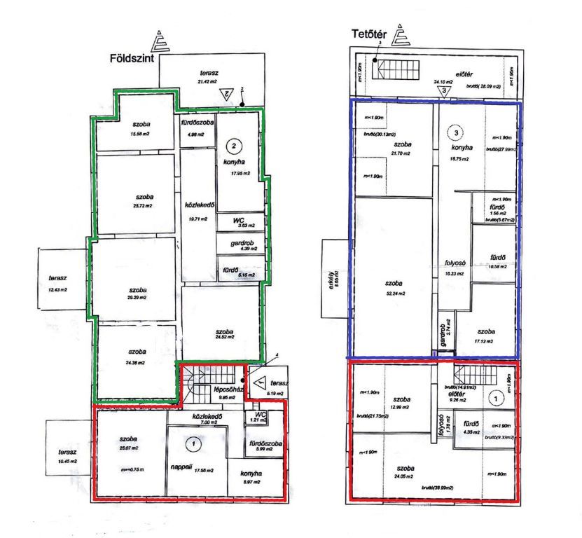 A földszinti lakás 175 nm-es, 5 szobás, két terasszal rendelkező lakás.