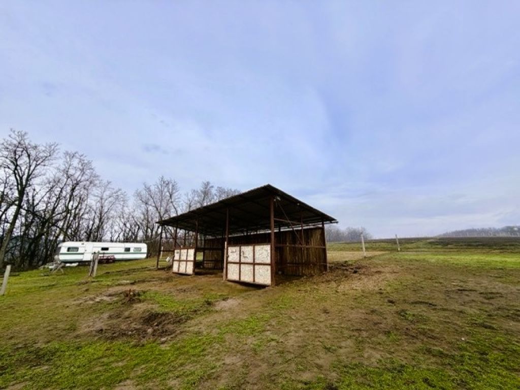 A 1974 m²-es telek részben fás, részben füves terület, amely lehetőséget kínál kertészkedésre vagy kisebb gazdálkodásra. A hátsó kertben egy 12 × 3 méteres, fedett vasszerkezet található, amely korábban állattartási célt szolgált, de tárolásra vagy több autó beállására is alkalmas lehet.