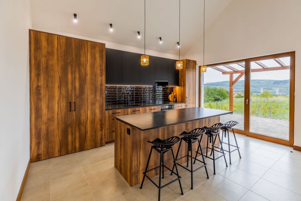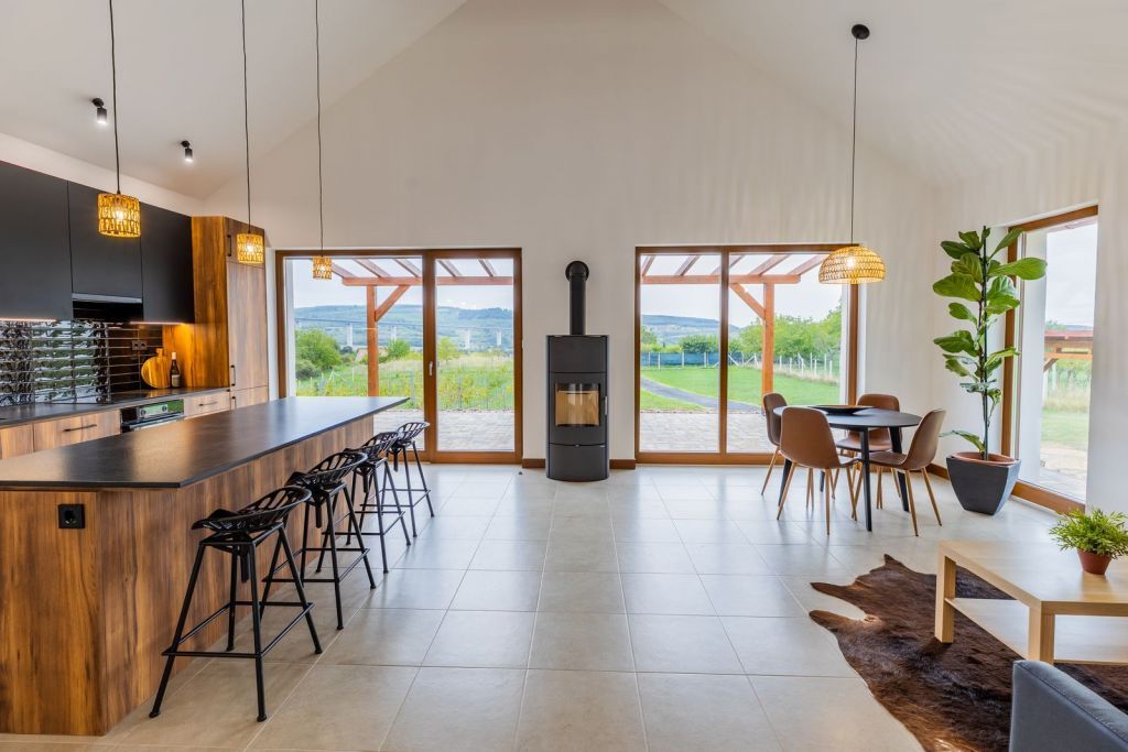 A ház belső tere világos, tágas, nagy üvegfelületei összekapcsolják a lakóteret a természet közelségével. A konyha-nappali-étkező egybenyitott központi térként szolgál, ahol a fatüzelésű, külső levegő bevezetésű Romotop kandalló és a panoráma együtt teremti meg a hangulatot.