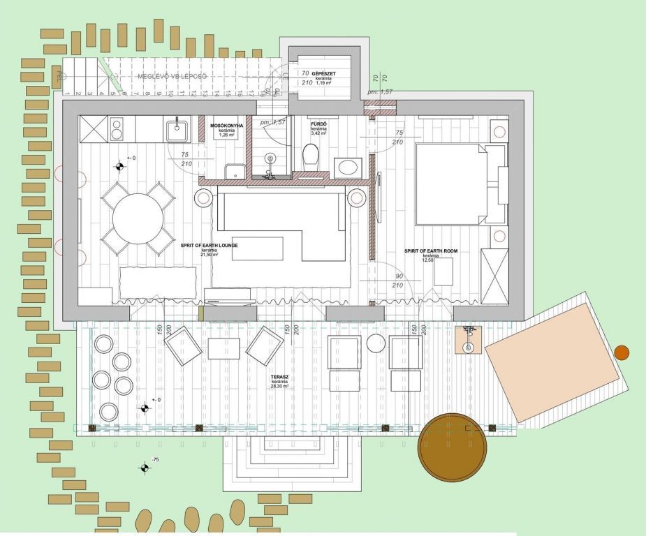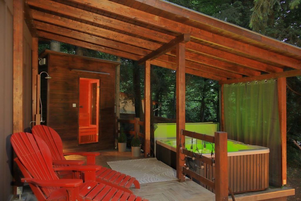 A kültéri wellness rész (jakuzzi és finn szauna) a vendégek számára teljes, kizárólagos használatot biztosít. Ezzel tovább erősíti az ingatlan egyedi hangulatát, amely kifejezetten alkalmas elvonulásra, feltöltődésre.