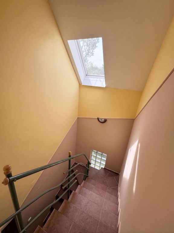 A két szint jól elkülönül, így a ház többgyermekes család számára is kényelmesen használható. A nappali keleti, a konyha déli tájolású, ennek köszönhetően a lakótér világos, kellemes hangulatú.