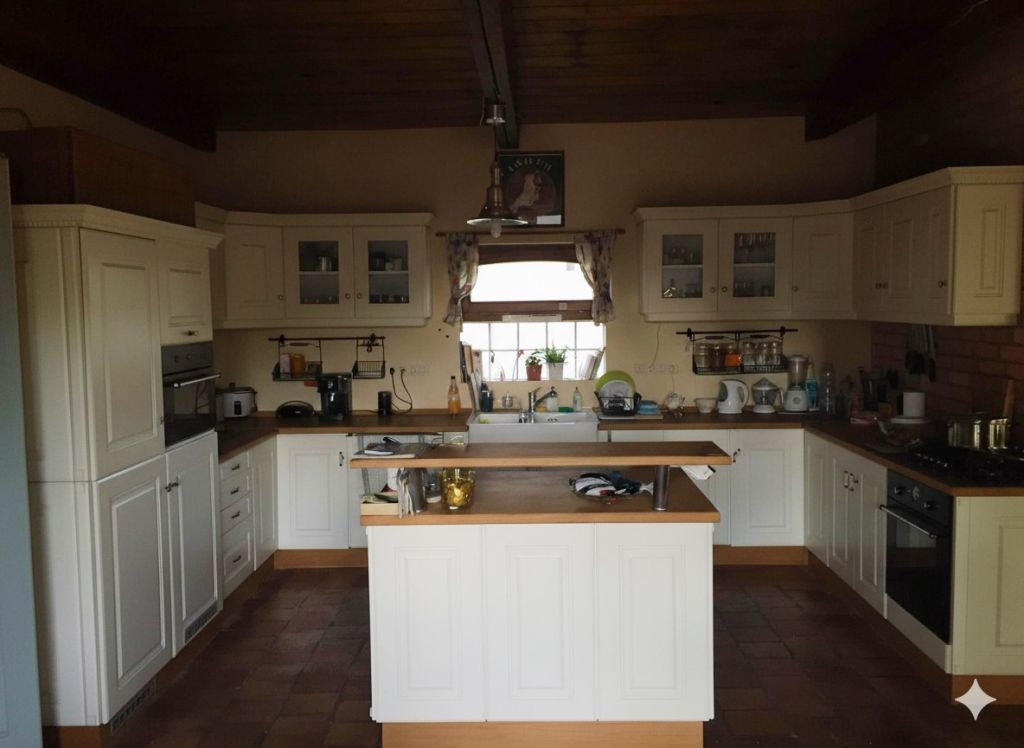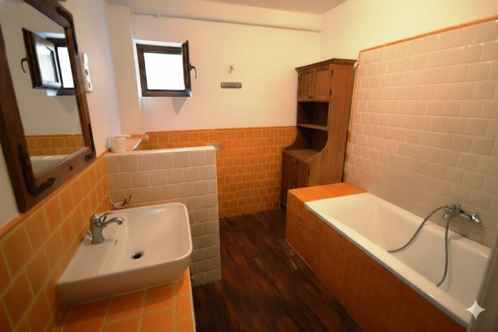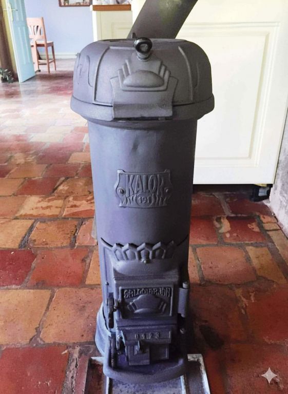 - A nappali-konyha központjában álló öntöttvas-kályha melegséget és rusztikus eleganciát sugároz, kiegészítve a helyiségeket borító rusztikus kő padló burkolattal.