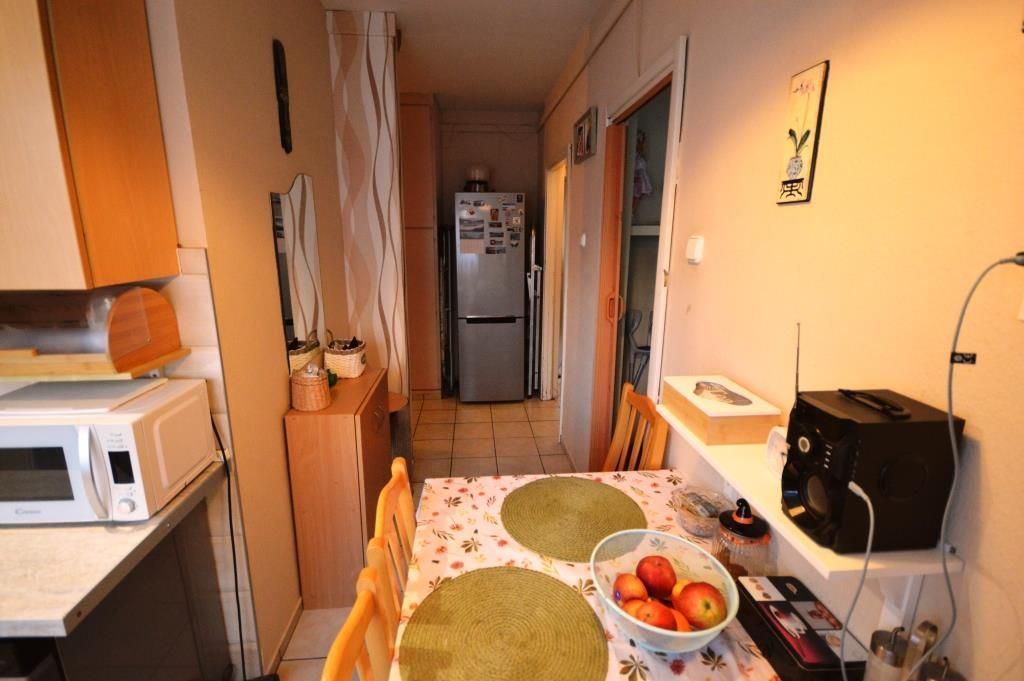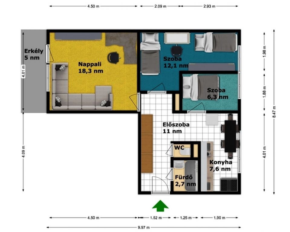 Nappali (18,3 nm), 2 szoba (12,1 és 6,3 nm), konyha (7,6 nm), fürdő (2,7 nm), WC (0,8 nm) és előszoba (11 nm) és erkély (5 nm).