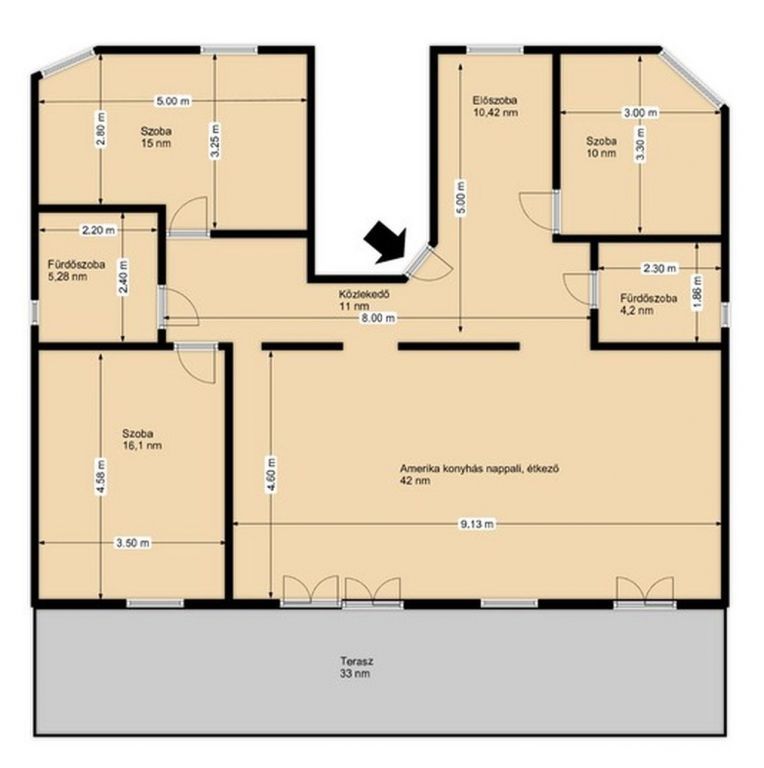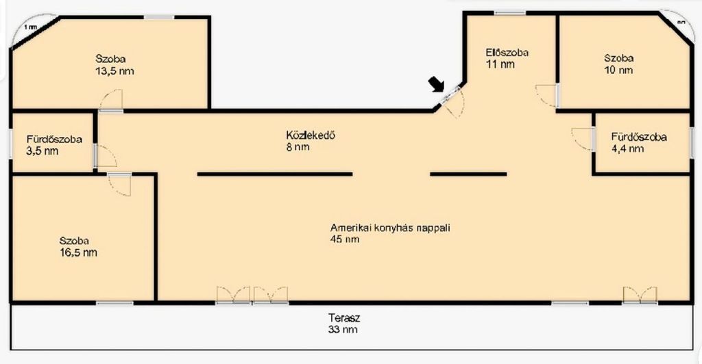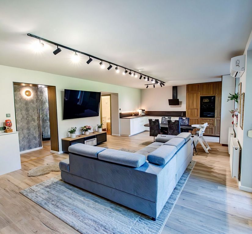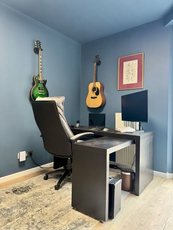 A nagy, napfényes, amerikai konyhás nappali a családi élet központja, míg a két tágas hálószoba és a harmadik, jelenleg dolgozószobaként használt helyiség kényelmes privát tereket biztosít. A két teljes értékű fürdőszoba tovább növeli a mindennapok kényelmét.