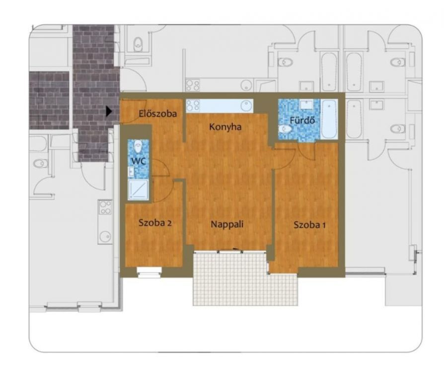A lakás déli tájolású, világos, terasza parkra néz, ami a környéken különösen kellemes lakókörnyezetet biztosít. A nappali amerikai konyhával egy légtérben található, mellette két külön nyíló szoba kapott helyet, így az elrendezés jól működik pároknak, lakótársaknak vagy akár otthoni munkavégzéshez is.