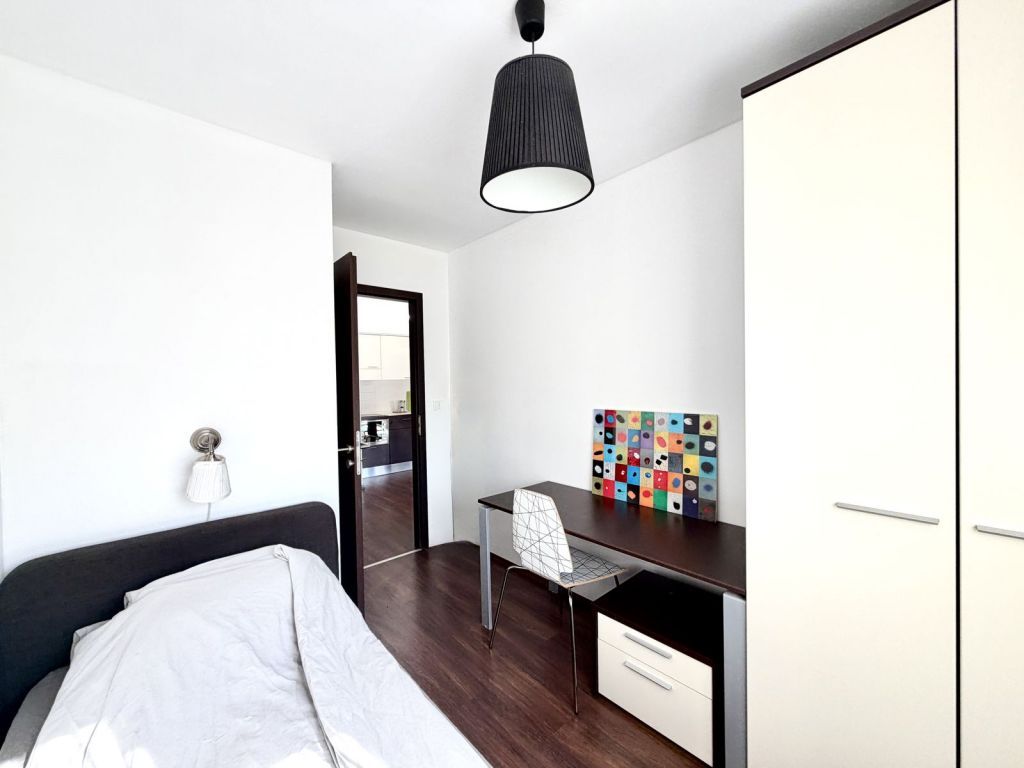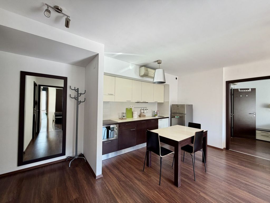 A déli tájolásnak köszönhetően a lakás egész nap világos, az erkély parkra néz, ami ritka nyugalmat biztosít a környéken. A nappali amerikai konyhával egy légtérben található, mellette két külön nyíló szoba kapott helyet, így ideális választás pároknak vagy két külön szobát igénylő bérlőknek, akár otthoni munkavégzéshez is.