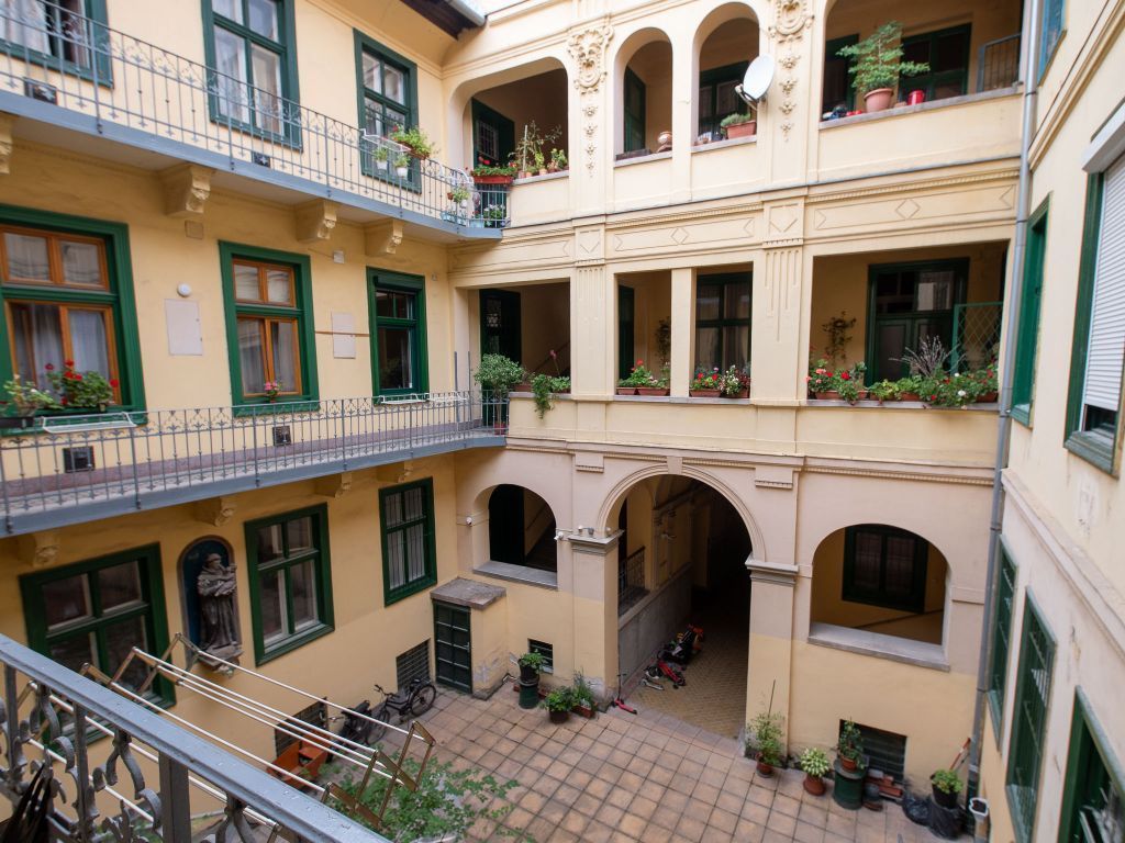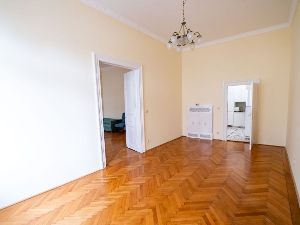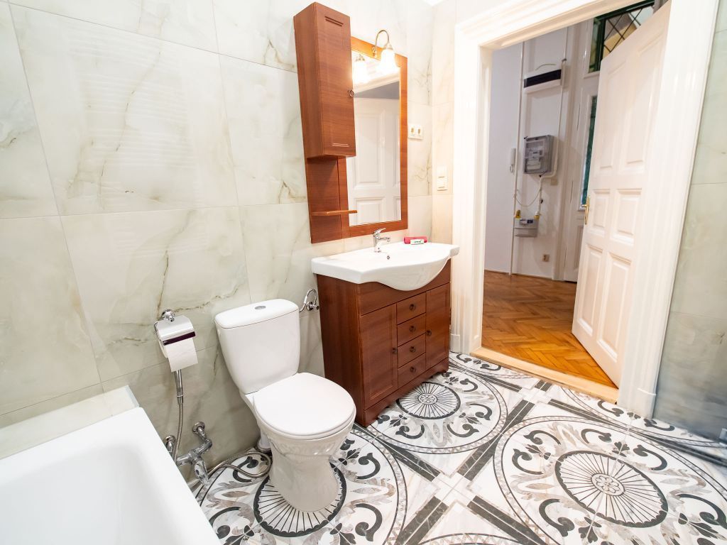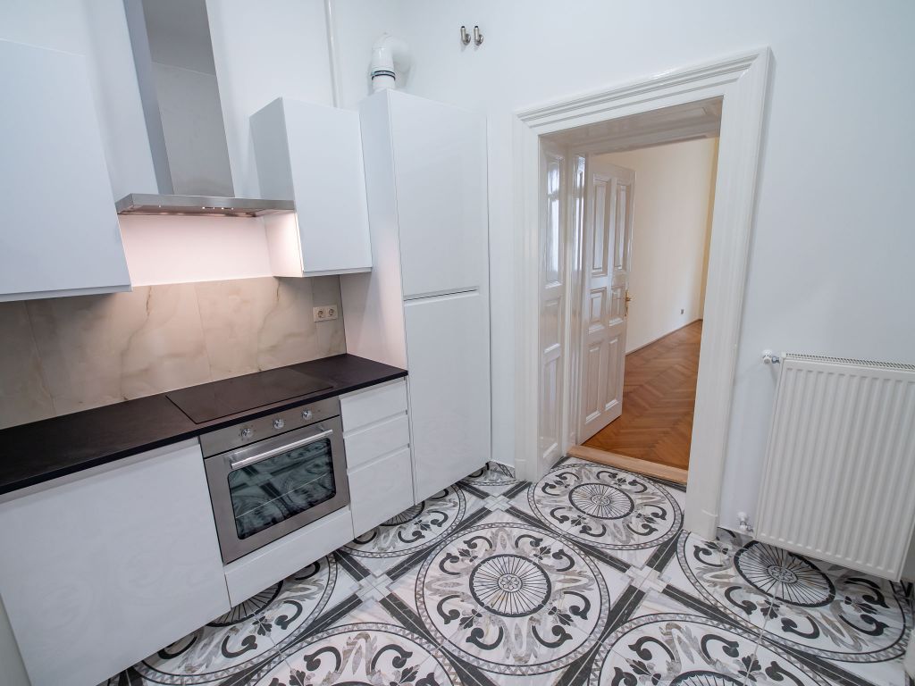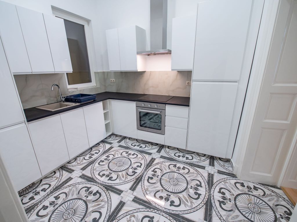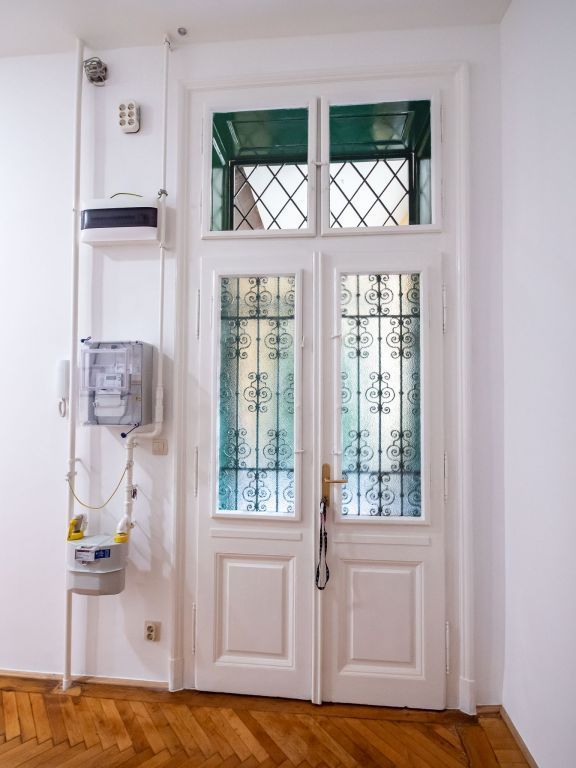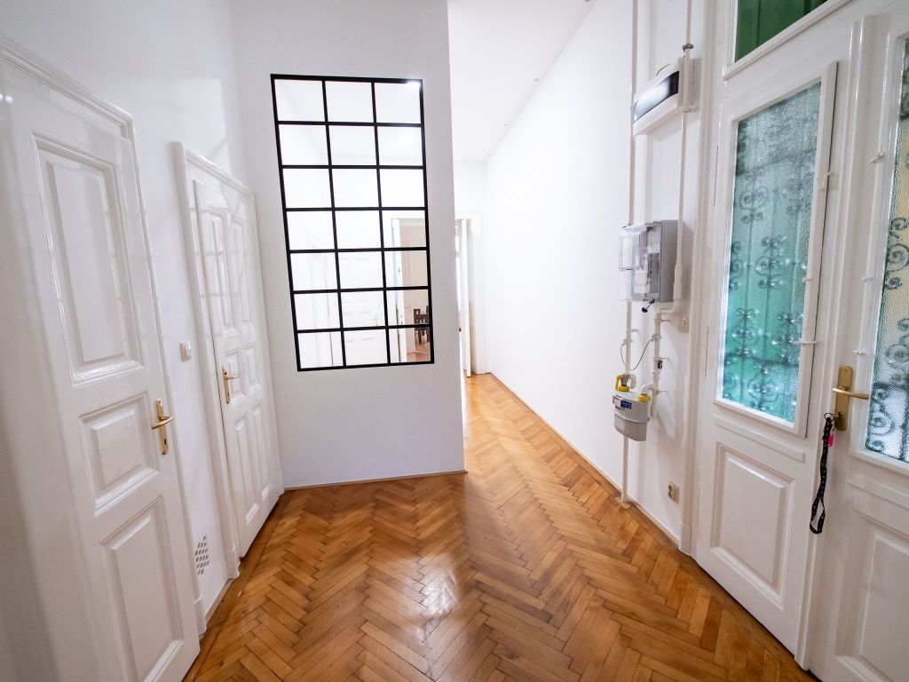 A lakás tágas, világos. Ez egy klasszikus nagypolgári lakás nagy belmagassággal . A konyha gépesített.