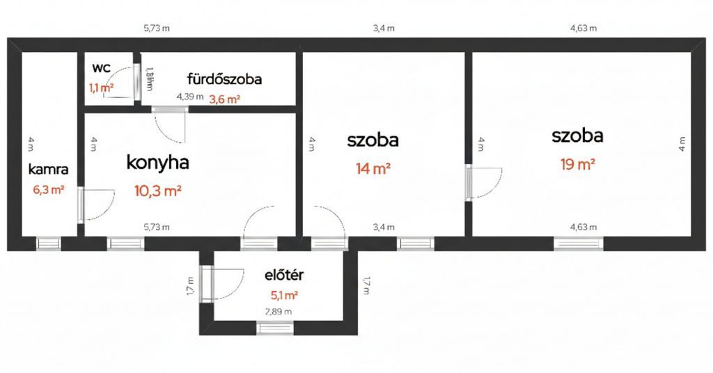 Konyha (10,3 nm), 2 szoba (19 és 14 nm), fürdő (3,6 nm), WC (1,1 nm), előtér (5,1 nm), kamra (6,3 nm) és terasz (5 nm).